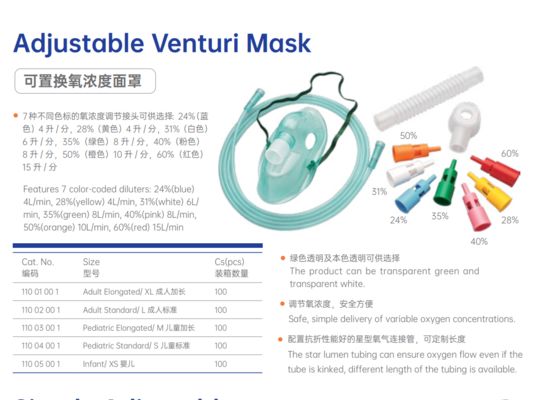 | 110 02 00 01 | Adult Standard/ L | 24%, 28%, 31%, 35%, 40%, 50%, 60% | 4L/min, 6L/min, 8L/min, 10L/min, 15L/min | 100 |